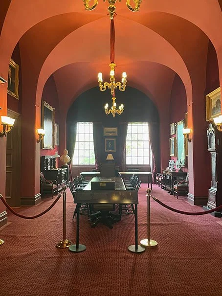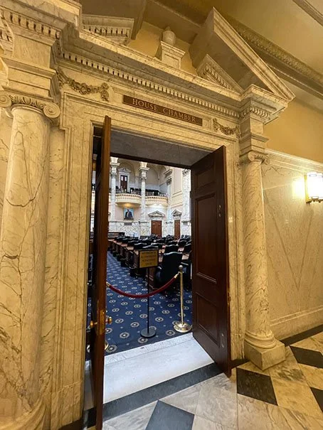 The adjoining Archives Room was originally a fireproof state records room; it now houses State House exhibits.