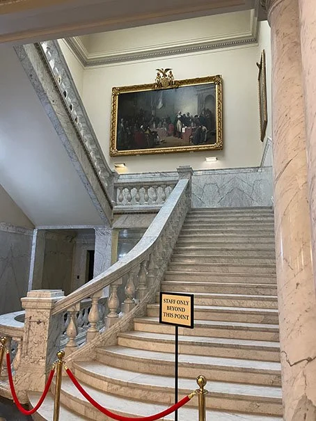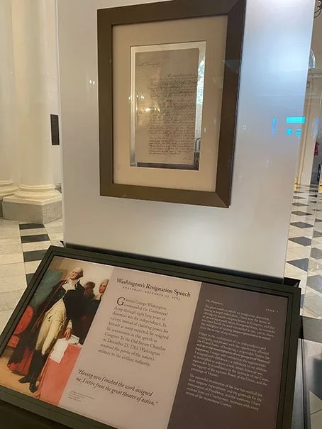 Washington resigned his commission in the Continental Army in the Old Senate Chamber on 23 December 1783, setting precedent that the military should be under civilian authority. This was at the end of the Revolutionary War. His bronze statue helps us imagine the moment he said, “I’m out.” A copy of his resignation speech is displayed in the rotunda.