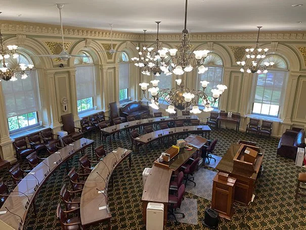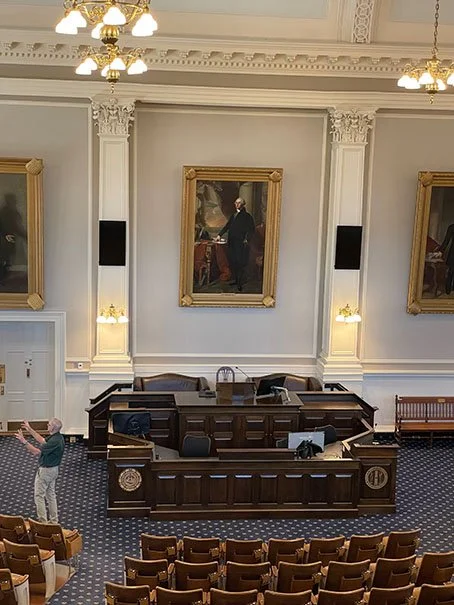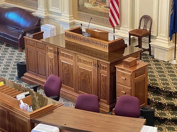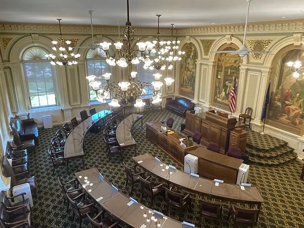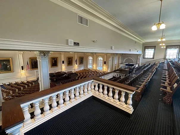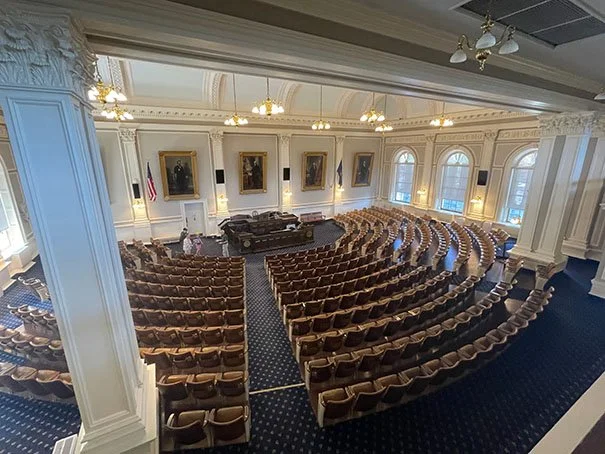 The Senate Chambers are much smaller, with only 24 New Hampshire state senators, and similar in size to the other state Senate chambers in New England.