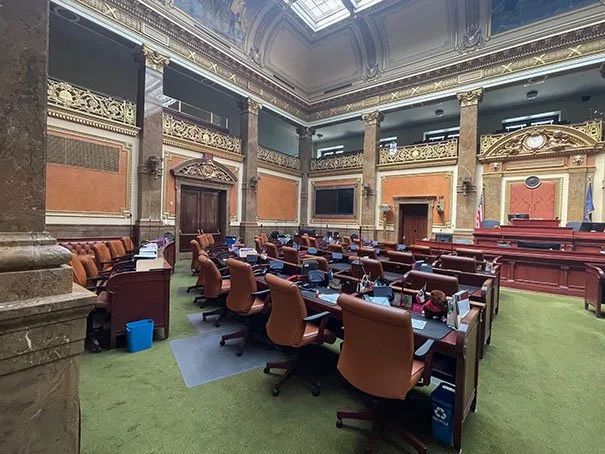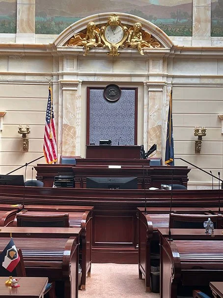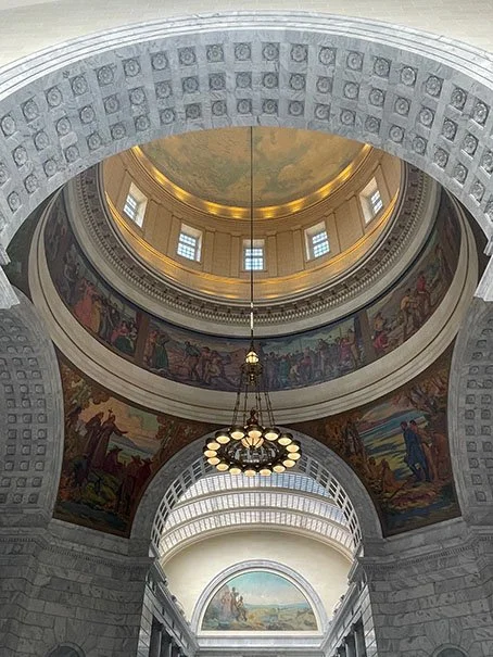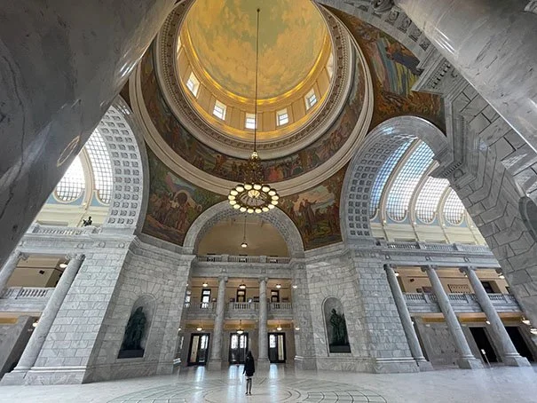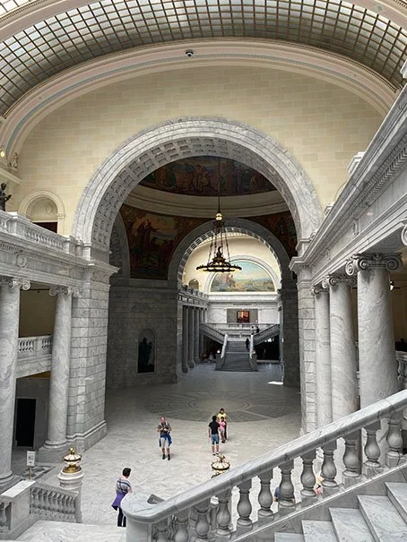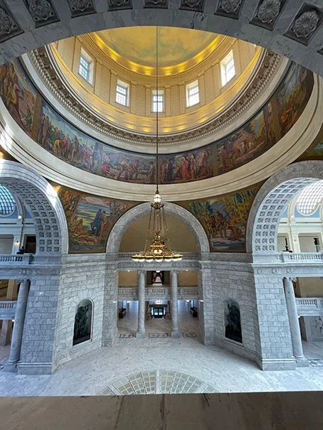 The Utah State Capitol is an artistic masterpiece throughout. The rotunda on the second floor is massive and close to the Utah Governor’s office. Within view of the rotunda, grand staircases rise to the third floor, where the Utah Supreme Court and Utah State Legislature meet. The Senate and House of Representatives chambers have beautiful murals along their ceilings, though I found the Senate chamber’s design especially impressive.