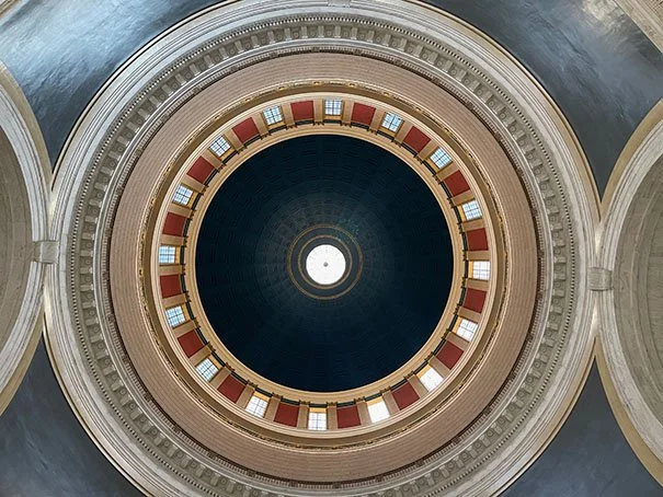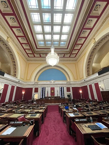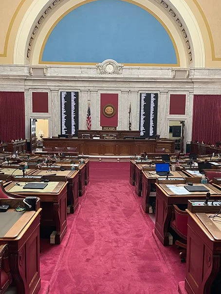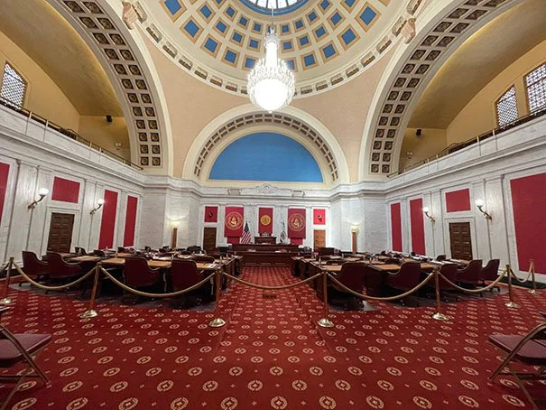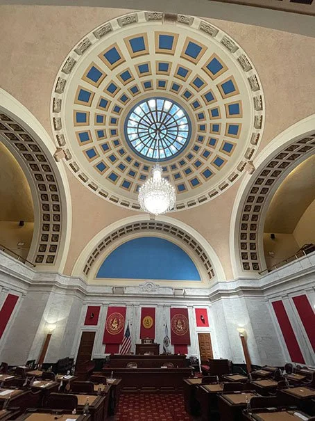 Inside, it is beautiful but simpler than most state capitol buildings. Most of the interior is marble. The rotunda features an 8-foot chandelier made of Czech crystal and 96 light bulbs. It is home to the West Virginia Governor and West Virginia Legislature, which consists of the Senate and House of Delegates.