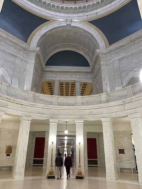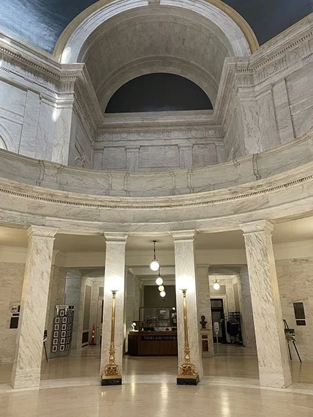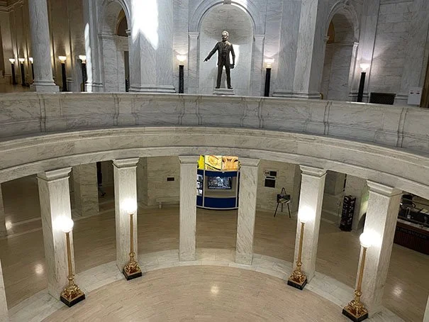 The first time I visited was with Snow, my dog, so I did not get to see the inside. I digress, but this is where I learned the importance of buckling your dog up when you are in the car. A car belonging to a local news crew nearly ran into us when they entered our lane near the Capitol Complex, and I hit the brakes so hard Snow, who was harnessed into the seat belt in the front seat, slid unharmed onto the floor in front of her. Snow walked it off quickly when we toured the outside. Thank you for listening.