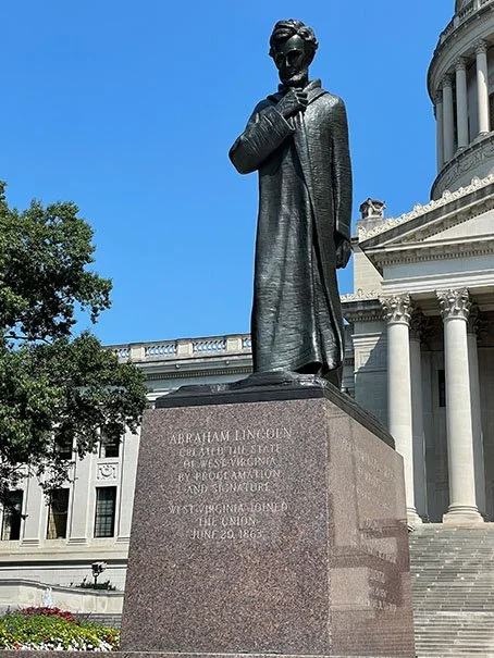 In the front of the building is the Abraham Lincoln Walks at Midnight statue, inspired by the 1914 Vachel Lindsay poem of the same name. It was designed by Fred Martin Torrey, a Fairmont, WV native who is also known for his statues at Lincoln’s tomb in Springfield, IL, and at the Iowa State Capitol.